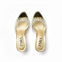 Mules à Talon Aiguille Dorées avec Bride Transparente Perlée – Couleurs : Or – Pointures 37/42