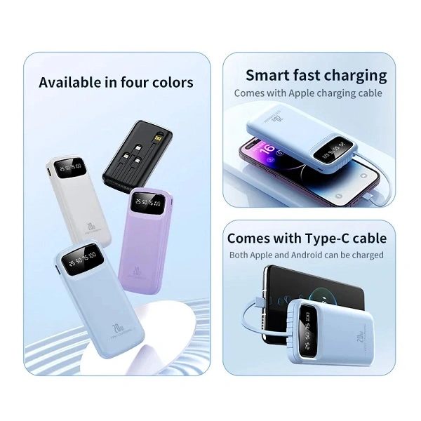 Power Bank 20 000 mAh : Charge Rapide, Câbles Intégrés