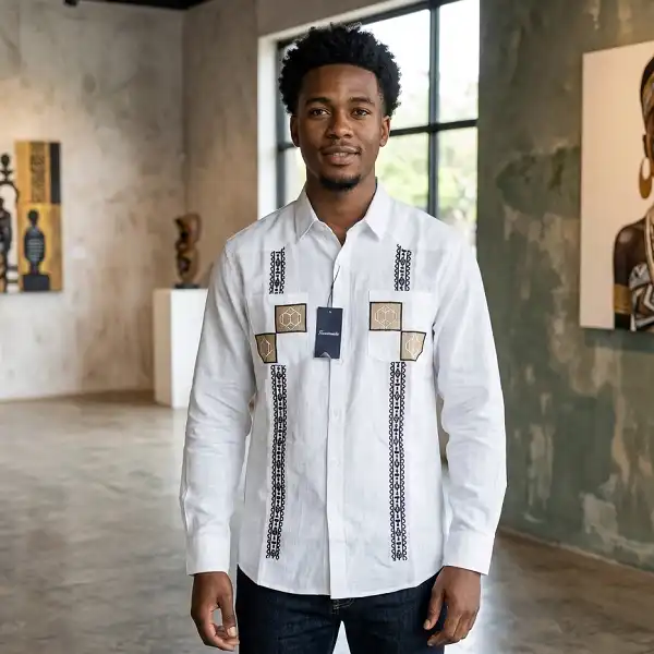 Tout d’abord, cette chemise se distingue par ses broderies noires verticales raffinées. De plus, les motifs géométriques au niveau de la poitrine apportent une touche originale et tendance. Ainsi, elle s’adapte facilement aux occasions formelles comme aux sorties casual.