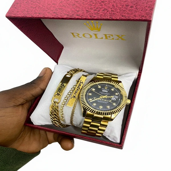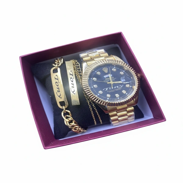 Coffret Luxe Personnalisé : Montre Style Rolex, Bracelet et Chaîne Gravés – Or & Noir