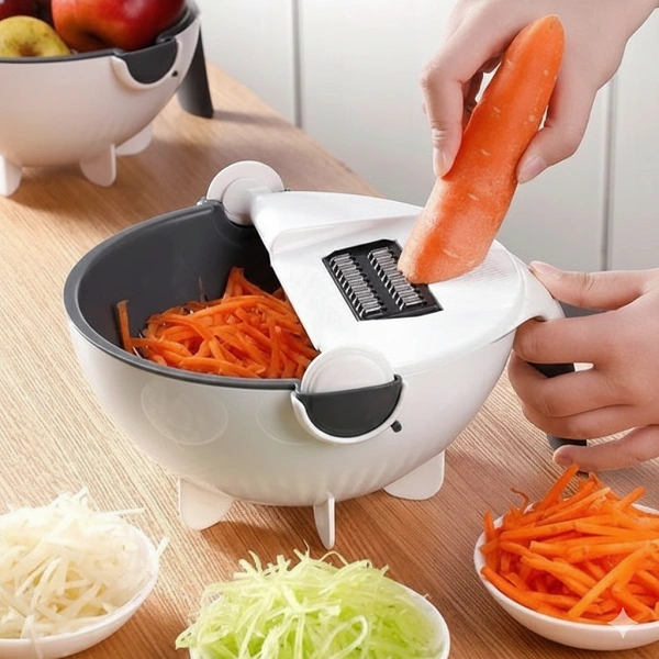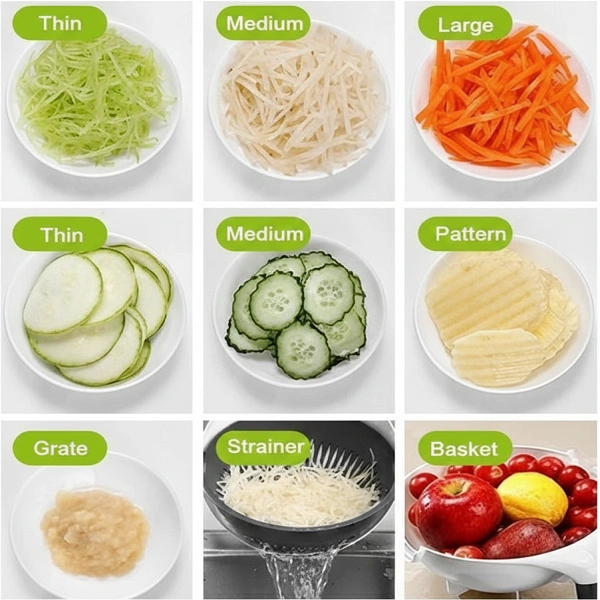 Dites adieu à la multiplication des bols, passoires et planches à découper. Notre coupe-légumes multifonction est conçu pour répondre à tous vos besoins de préparation en un seul appareil compact et ingénieux.