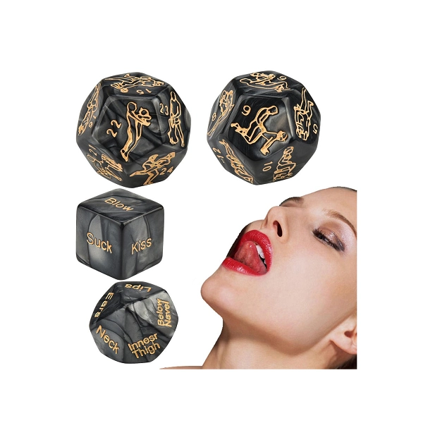 Le set comprend un total de quatre dés, chacun ayant une fonction spécifique. Non seulement vous trouverez deux dés cubiques pour les actions ou les zones du corps (comme “Kiss” ou “Inner Thigh”), mais en plus les deux dés polyédriques offrent des illustrations suggestives et des numéros pour encore plus de variété. Par conséquent, la combinaison des dés assure que chaque lancer est unique, maintenant l’excitation et l’anticipation.