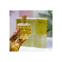 Le flacon de 100 ml se distingue par son design texturé en relief, évoquant une mosaïque moderne. Sa transparence laisse entrevoir un liquide doré, symbole de chaleur et de sophistication. Le bouchon métallique doré ajoute une touche de luxe à l’ensemble, tandis que la boîte dorée à motif craquelé renforce l’aspect premium du produit.