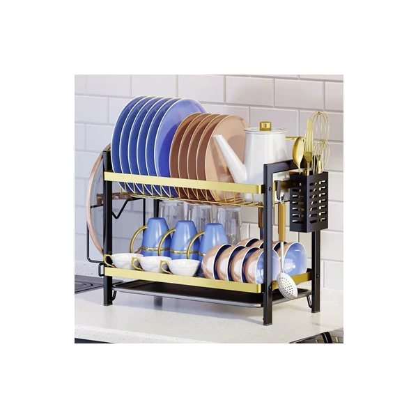 Classeur de Vaisselle à 2 Niveaux – Grand Séchoir Multifonction avec Porte-Ustensiles et Plateaux d’Égouttage