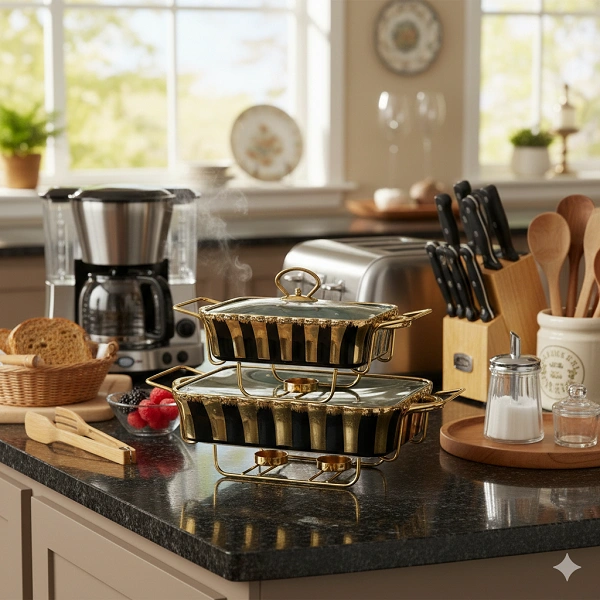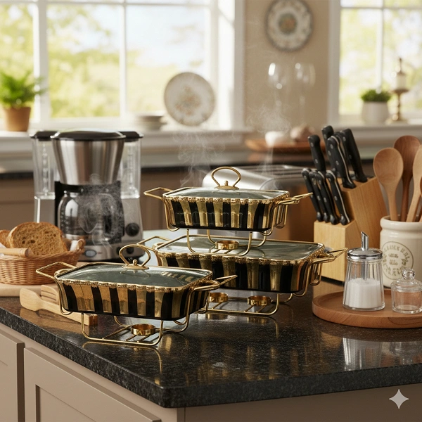 Apportez une touche de luxe “Art Déco” à vos réceptions. Cet ensemble de Chafing Dishes se distingue par son motif à rayures verticales dorées et noires, offrant un contraste chic et intemporel.