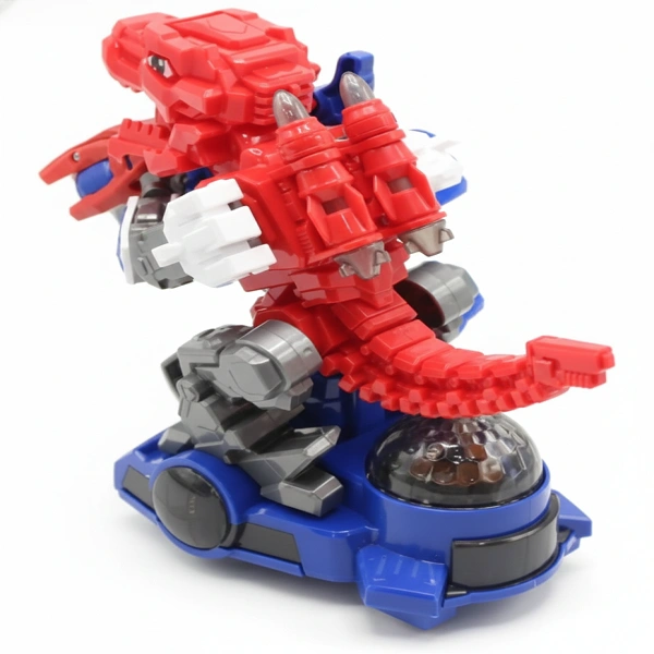 - Design Hybride Spectaculaire : Le modèle présente un T-Rex puissant aux couleurs vives (rouge et bleu) et une armature de machine complexe (noir et gris), combinant l’attrait d’un dinosaure classique et d’un robot futuriste.