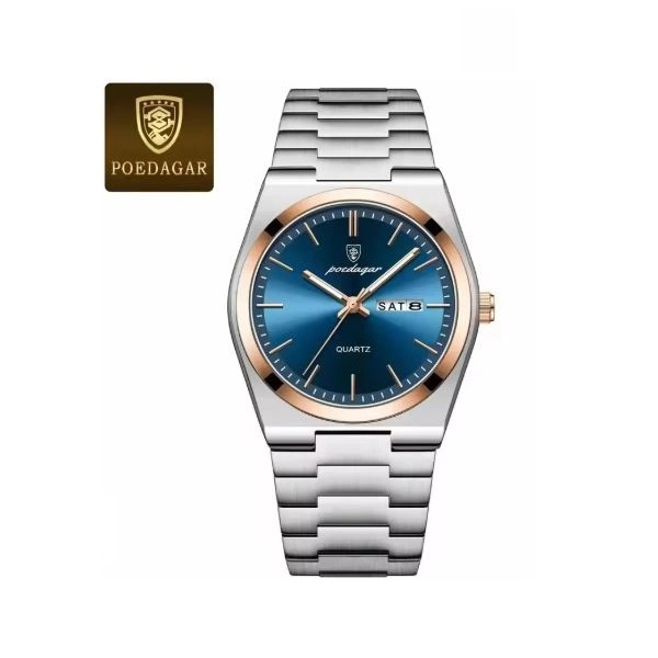 Montre de Luxe POEDAGAR pour Homme – Cadran Bleu Solaire, Acier Inoxydable, Étanche & Calendrier (Coffret Complet)
