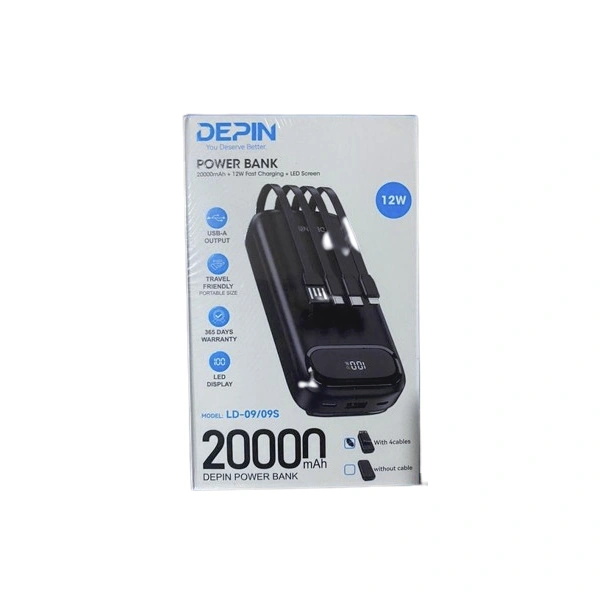 Power Bank Depin 20000 mAh – Charge Rapide 12W avec 4 Câbles Intégrés, LED, Compacte et Garantie 3 Mois