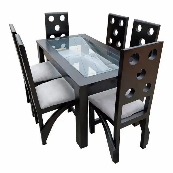 Vous recherchez une salle à manger moderne au Cameroun qui combine élégance, solidité et confort ? Cette salle à manger moderne 6 places avec table en verre en bois foncé est conçu pour sublimer votre intérieur. En effet, il s’intègre parfaitement dans les maisons contemporaines à Douala, Yaoundé et partout au Cameroun.