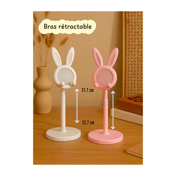 • Support de téléphone bureau en forme de lapin kawaii, couleur rose pâle, réglable en hauteur pour un maintien stable de smartphone
