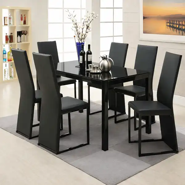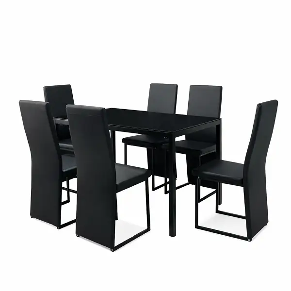 Ensemble Table à Manger Moderne Noir – Plateau Verre Trempé & 6 Chaises Minimalistes