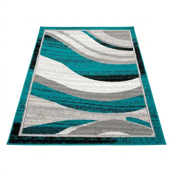 Ce tapis se distingue par ses motifs inspirés de vagues ou de tourbillons. Ainsi, les nuances de turquoise, gris, blanc et noir créent une ambiance moderne et apaisante. De plus, il s’intègre facilement dans tous les styles de décoration.